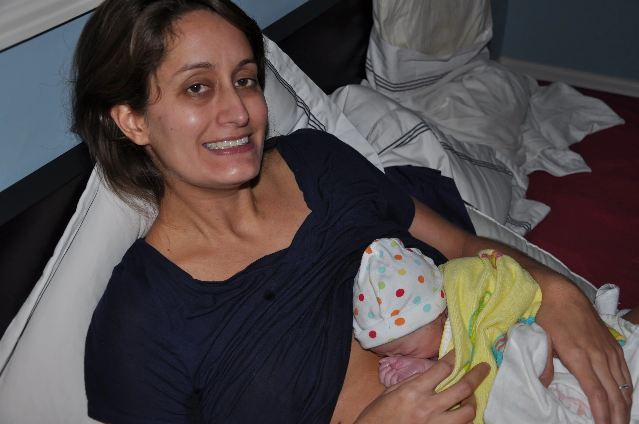 We called C. in to meet her new sister, and she helped the midwife weigh and dress the baby. Baby A was declared healthy and beautiful. I took a long hot shower and got back into my bed. We ordered pizza and ate dinner together in bed. I fell asleep at some point and the midwife quietly left.